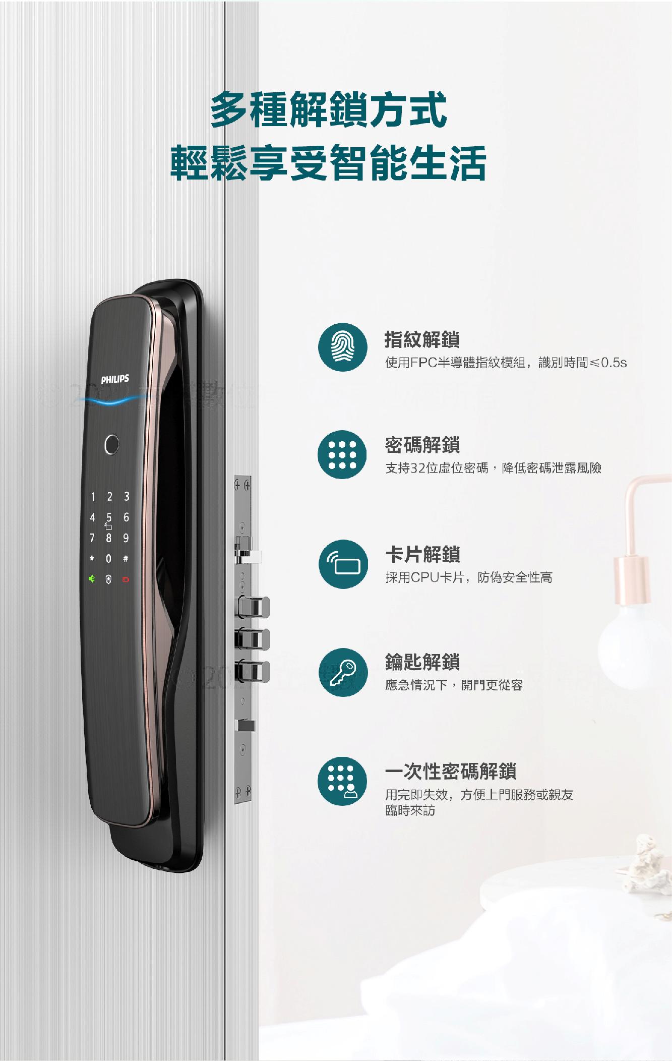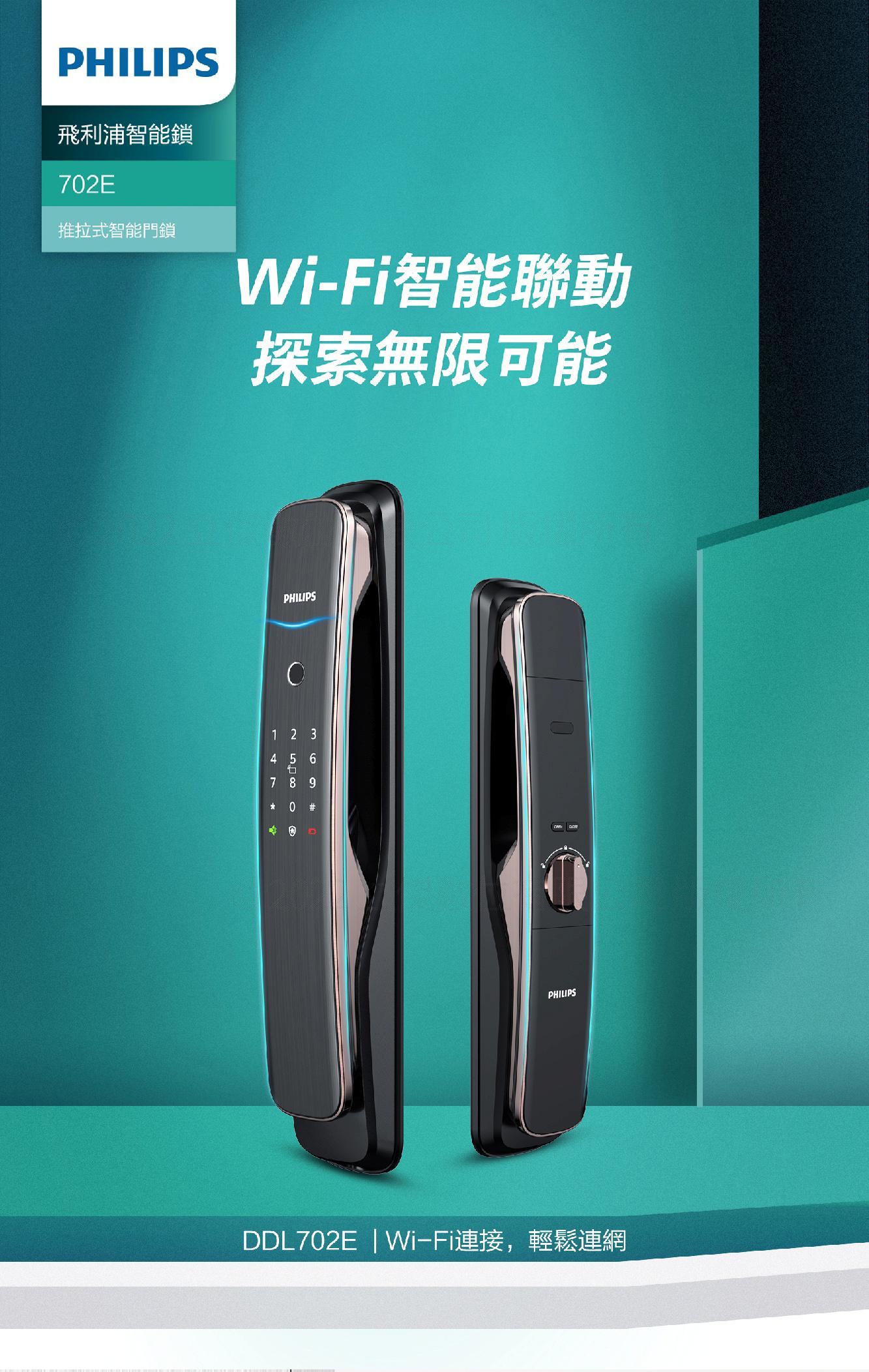 Philips 飛利浦 702E 五合一推拉式聯網電子鎖 指紋/卡片/密碼/鑰匙/WiFi (不含安裝)