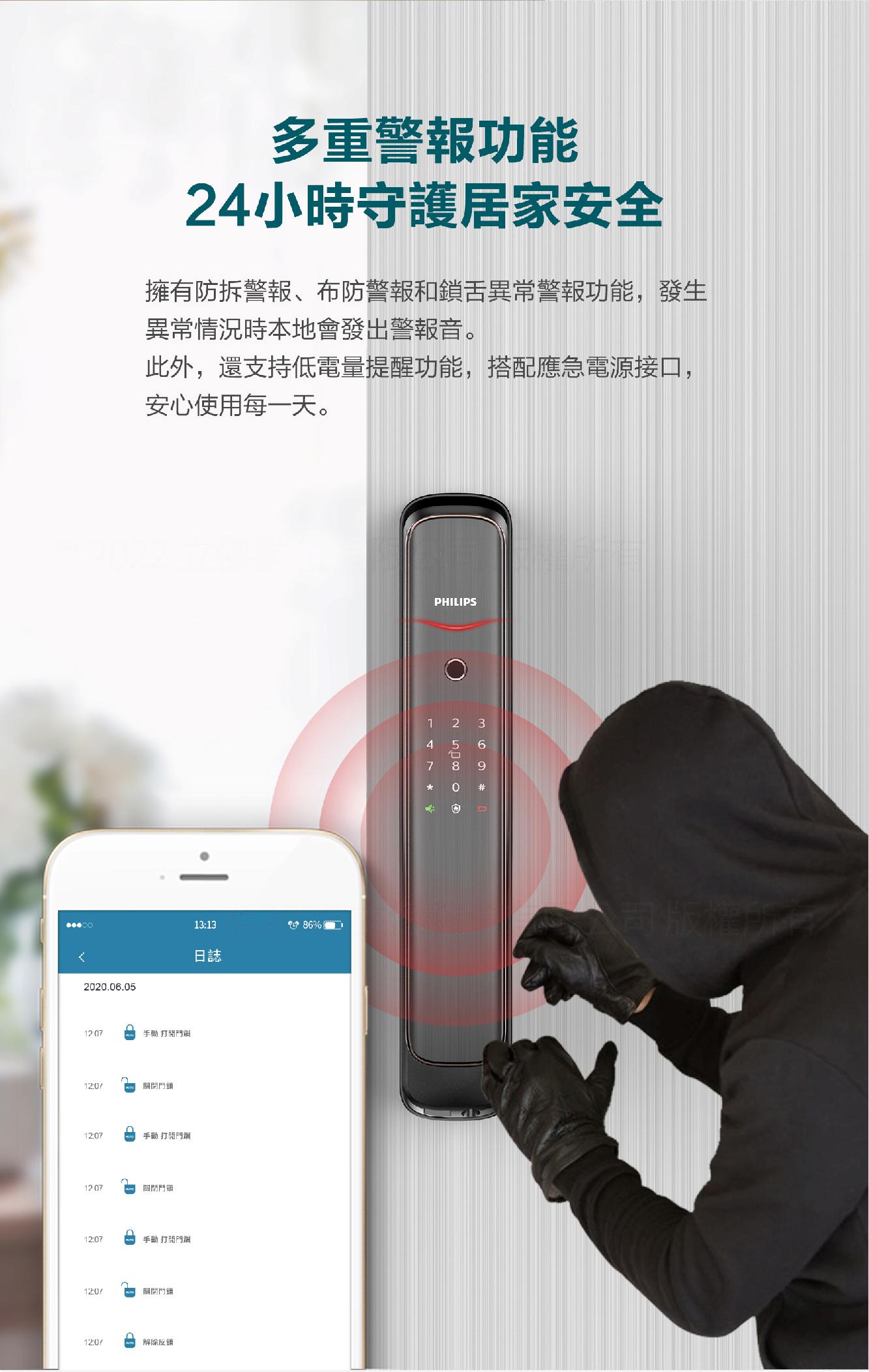 Philips 飛利浦 702E 五合一推拉式聯網電子鎖 指紋/卡片/密碼/鑰匙/WiFi (不含安裝)★80B010