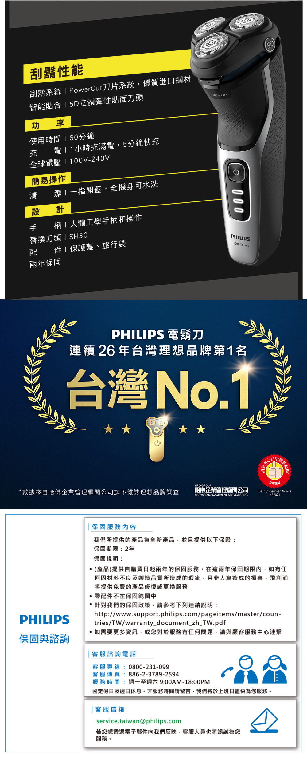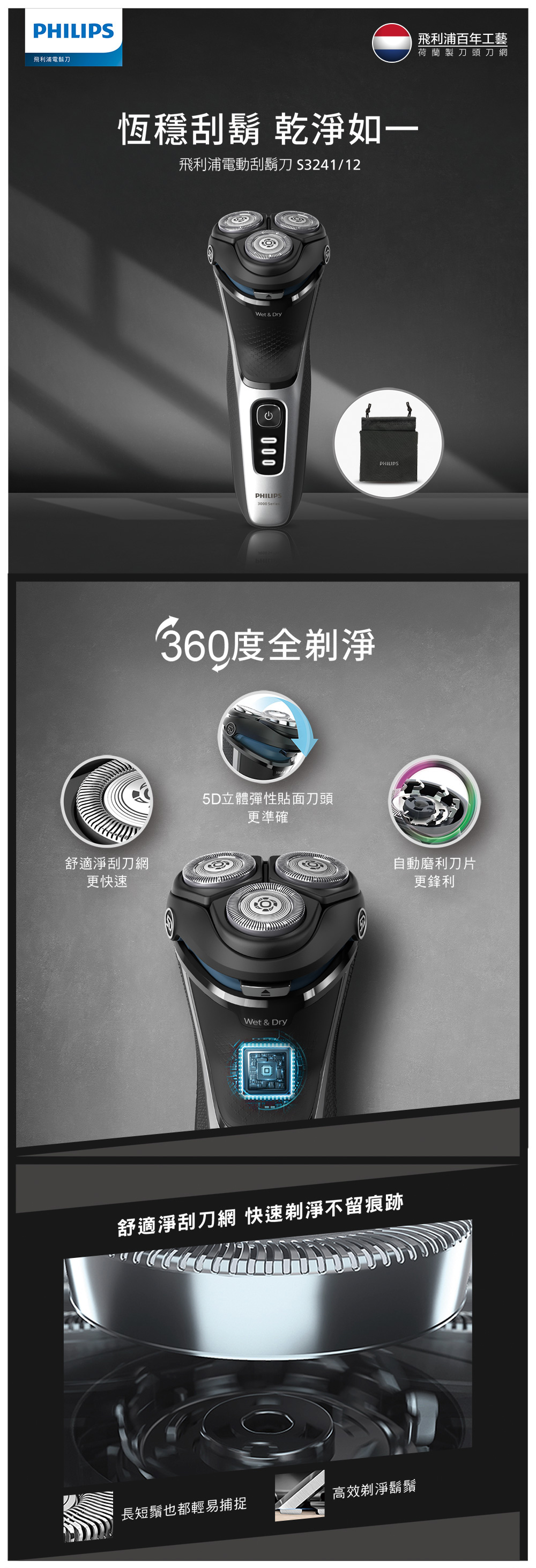 【PHILIPS 飛利浦】 Series 3000 三刀頭電鬍刀 S3241/12★80B010