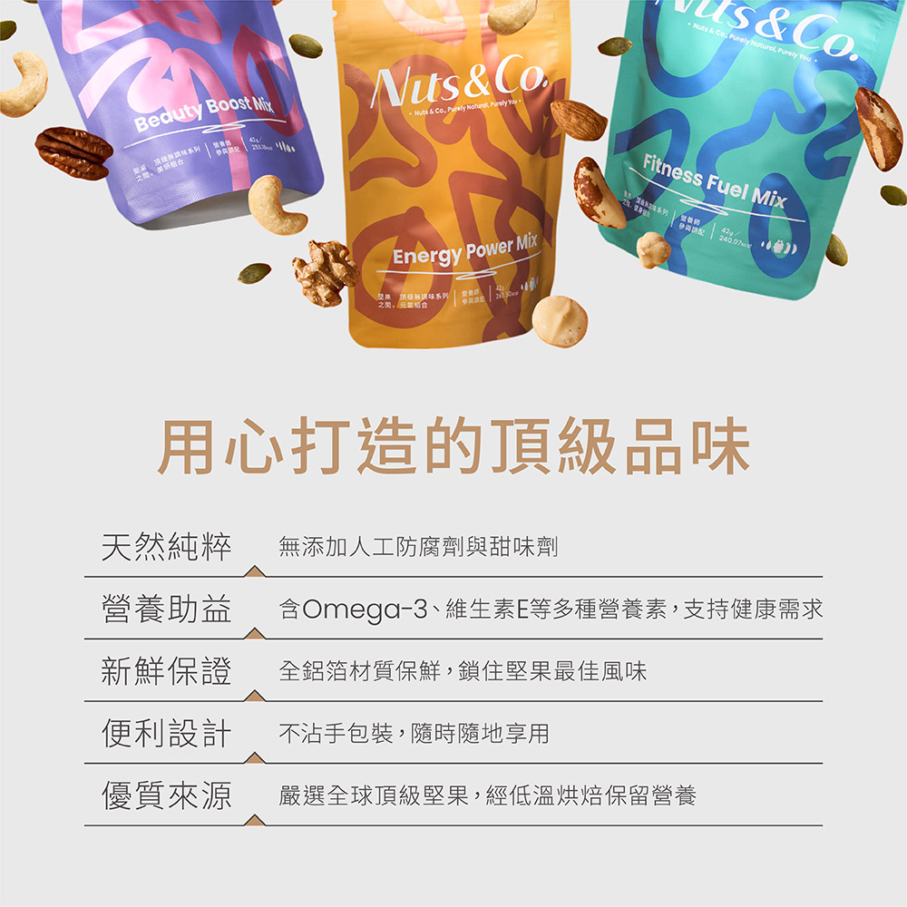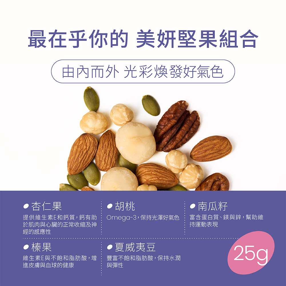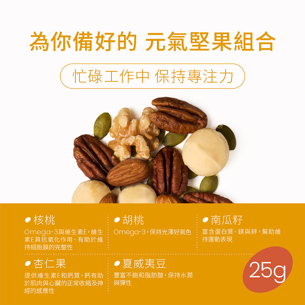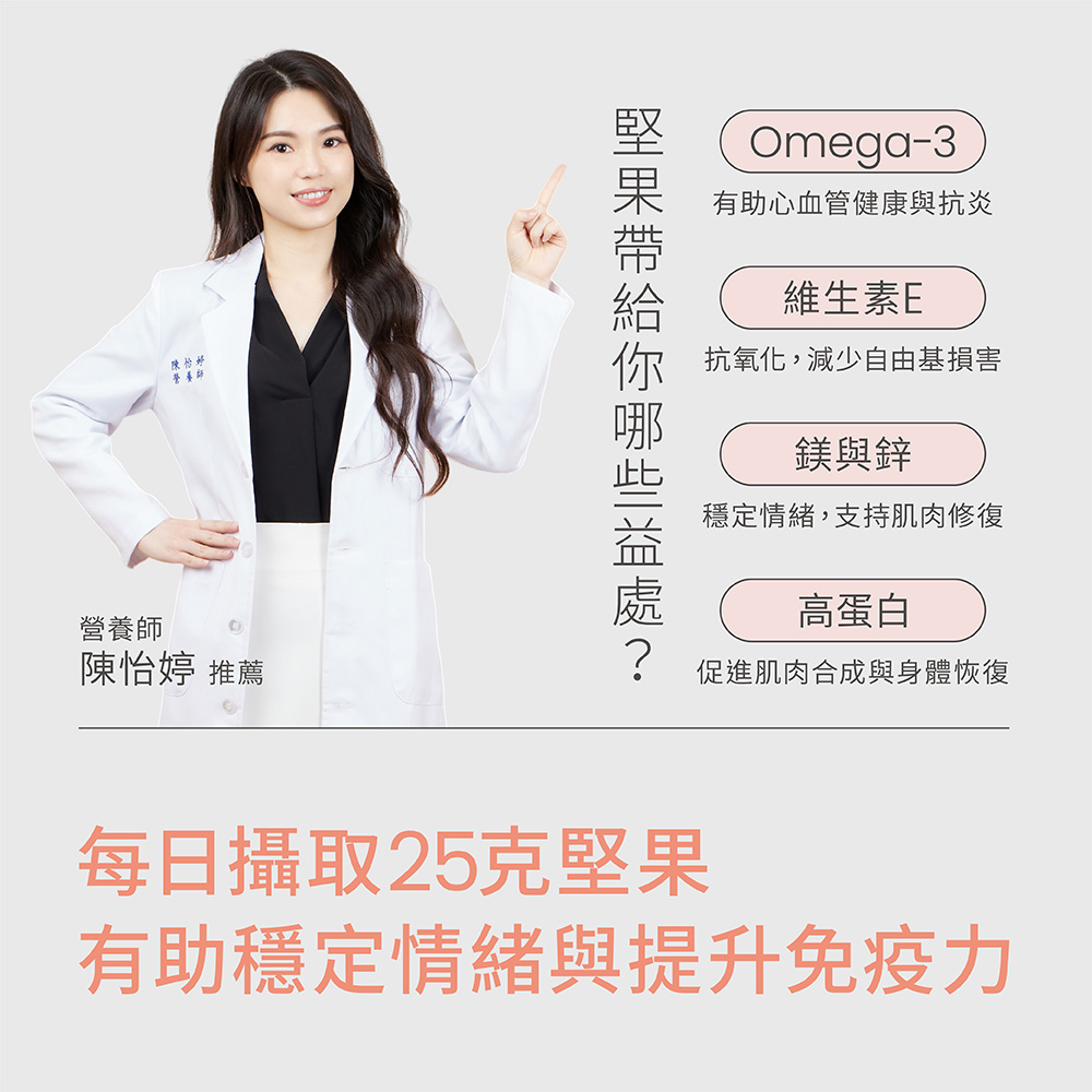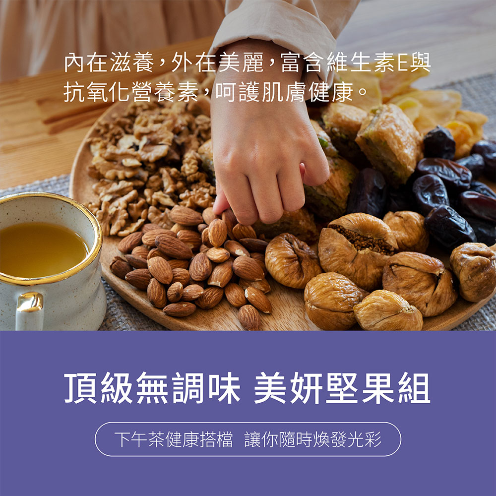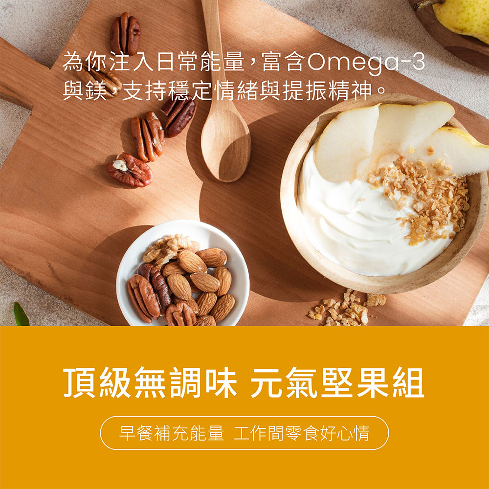 - *營養均衡搭配:多種堅果組合,富含蛋白質、Omega-3、維生素E、鎂、鋅等營養素,助於健康管理。