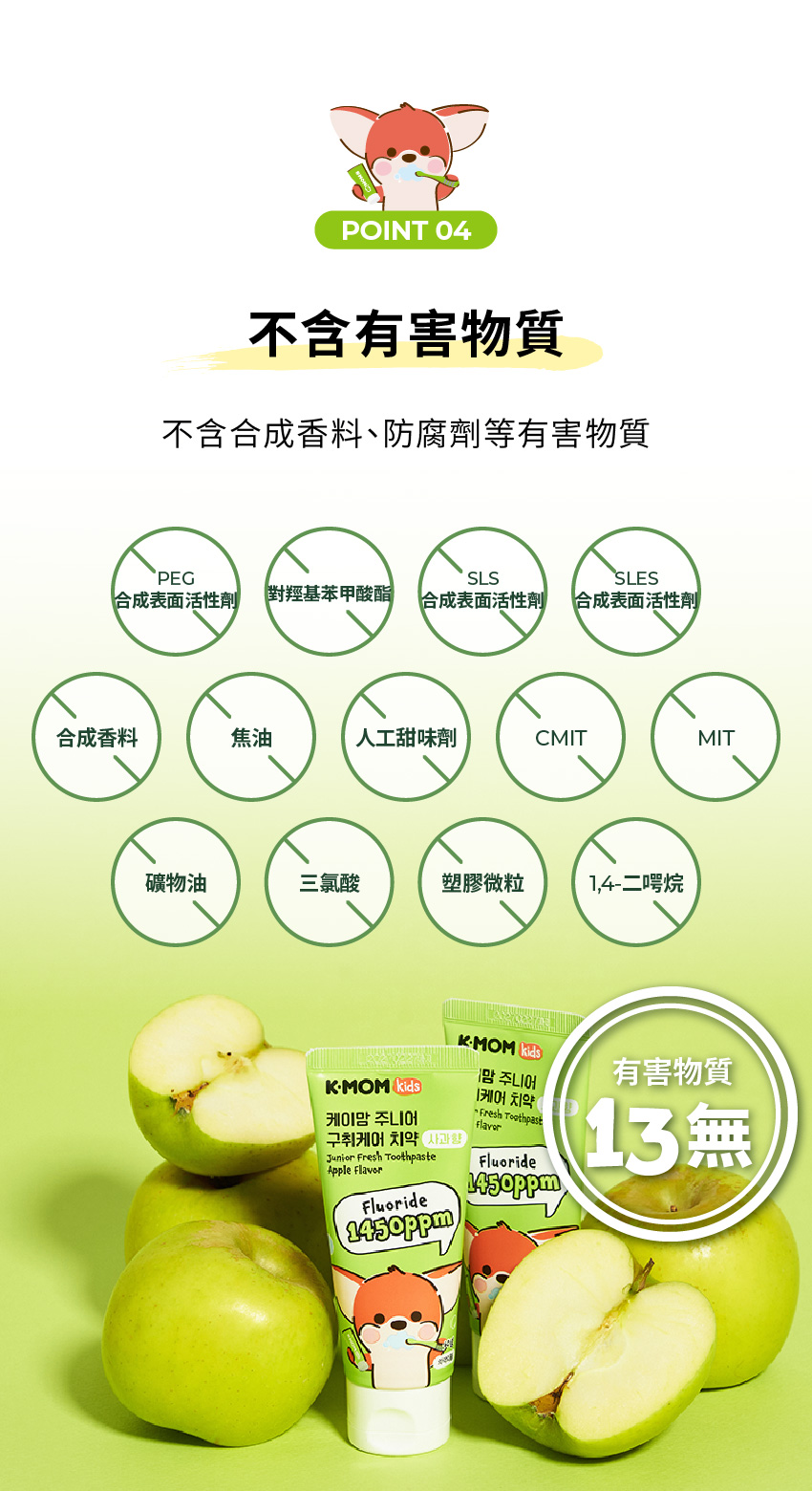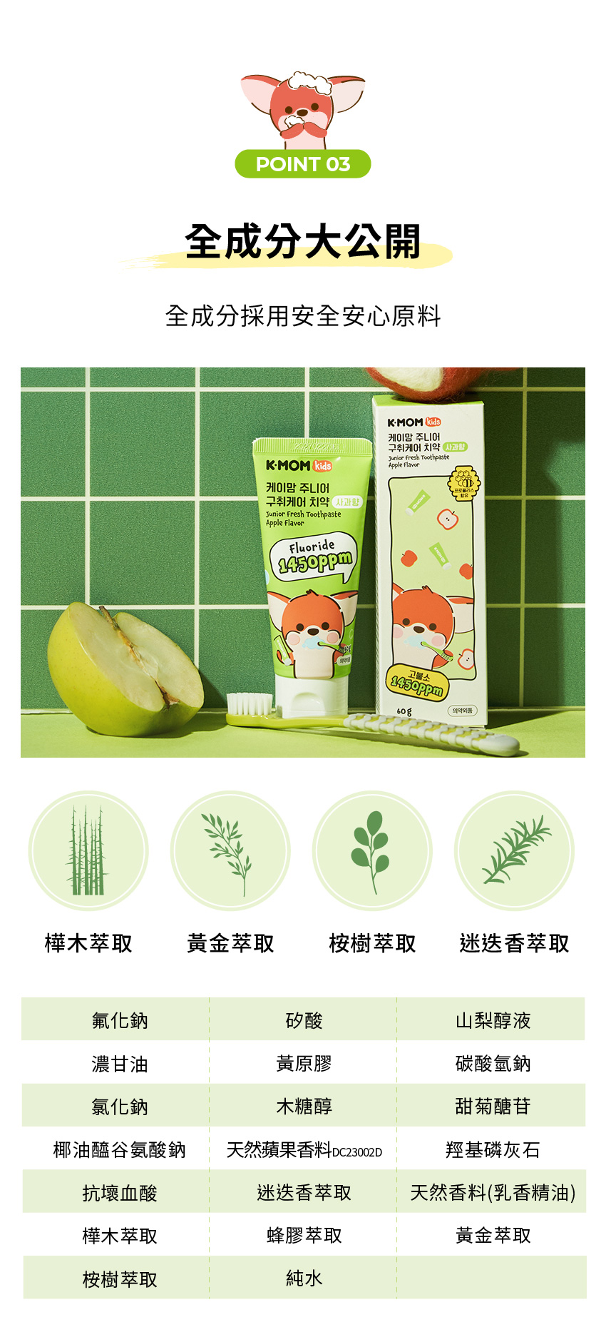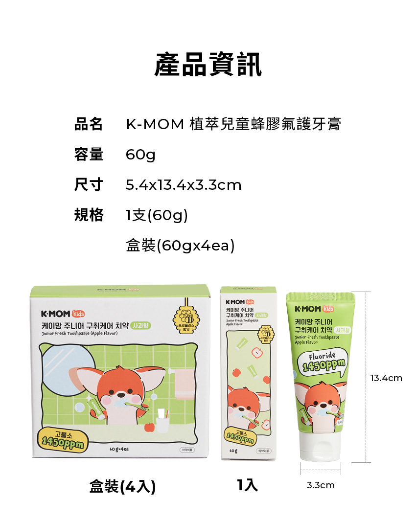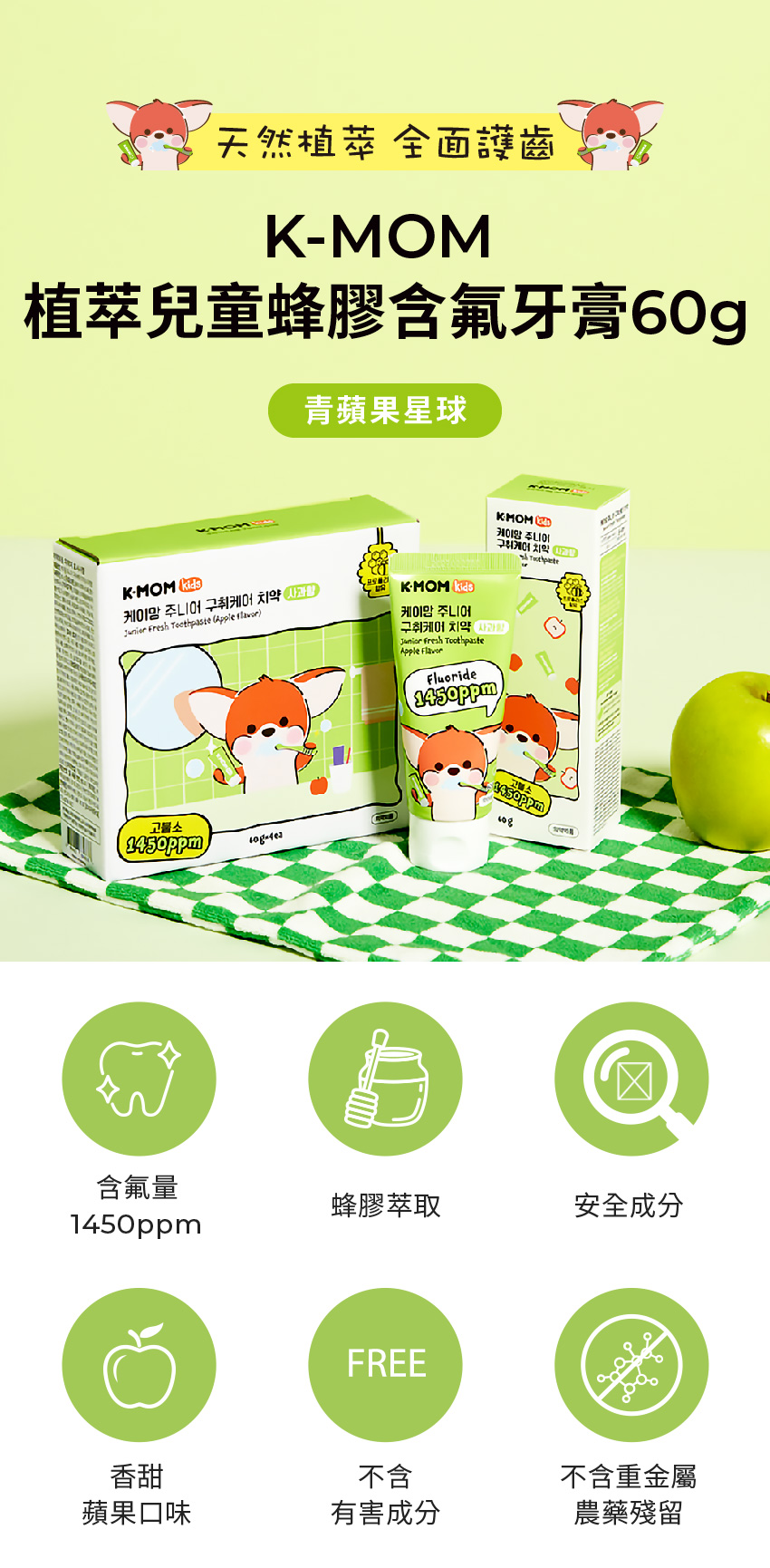 - 源自韓國母嬰品牌MOTHER-K的植萃兒童蜂膠含氟牙膏,青蘋果星球60g,4入組。晶采生活,專營口腔清潔商品,護齒必備,質感卓越。