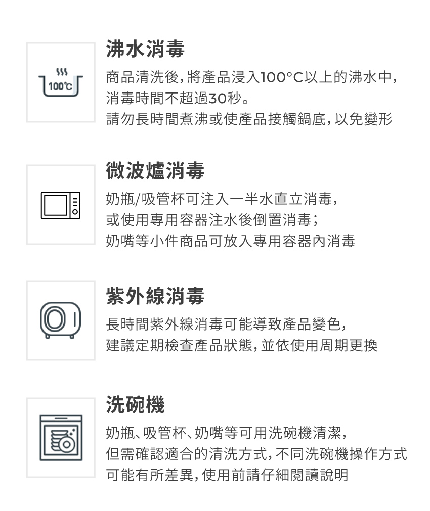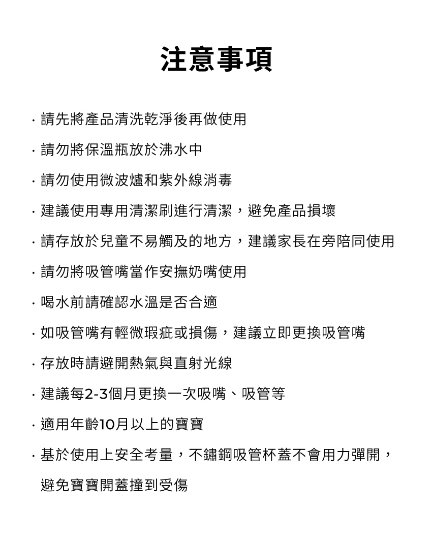 - 請勿將保溫瓶放於沸水中、請勿使用微波爐、紫外線消毒
