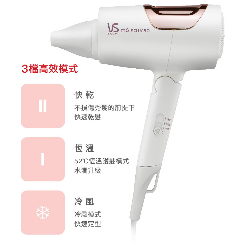◆三檔模式(快乾/恆溫/冷風)調節,可依照不同髮質和吹整需求調節。