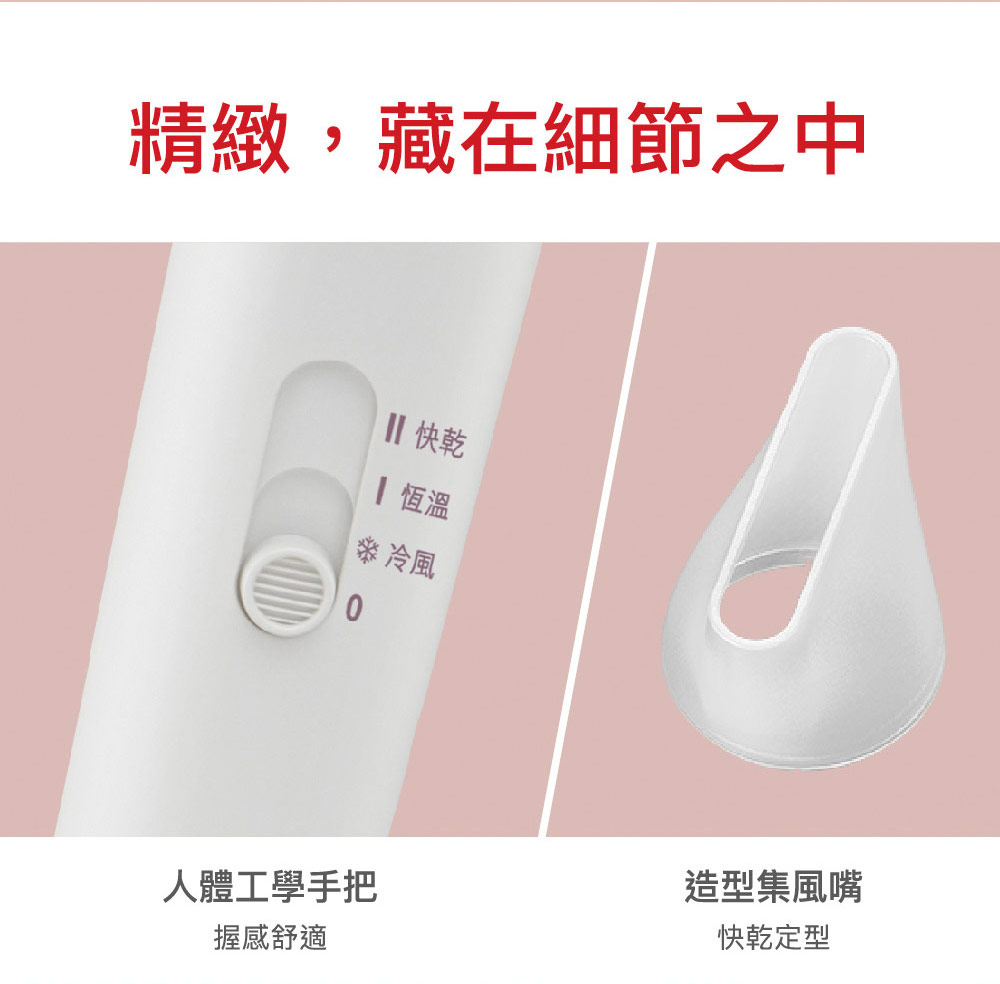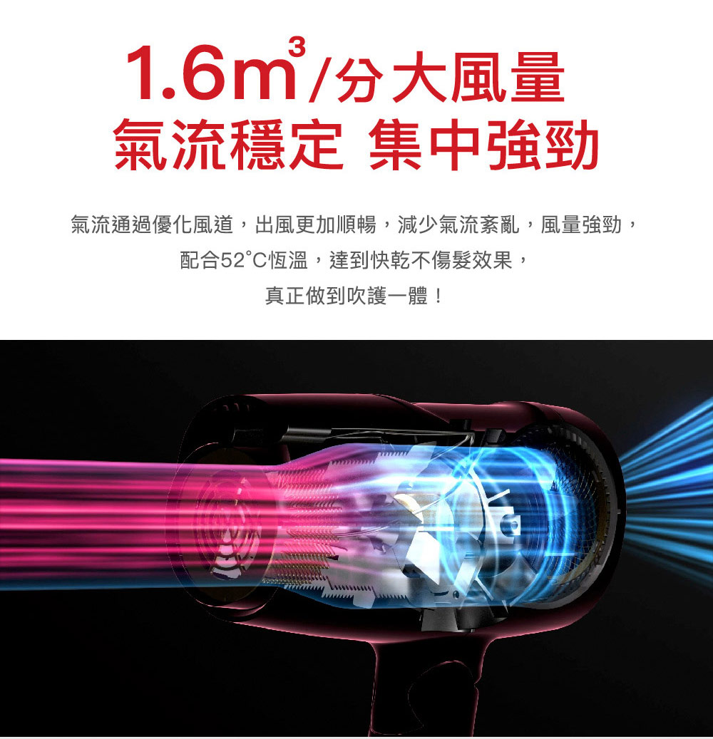◆1.6m³/分大風量,氣流穩定、集中強勁,搭配52°C恆溫,快乾又不傷髮,真正達成吹護一體。
