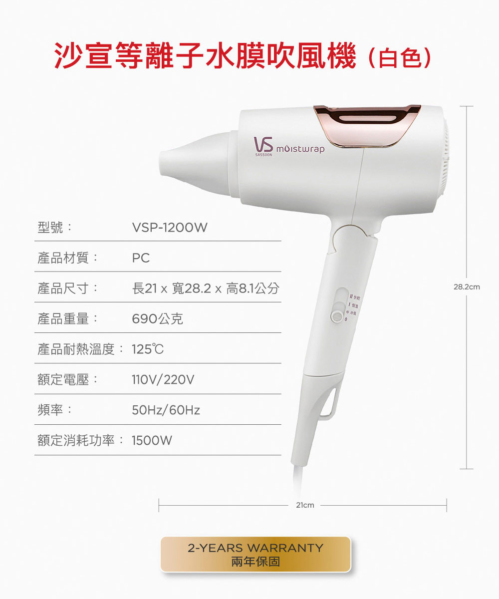 VS 沙宣 等離子水膜雙電壓摺疊吹風機-白 VSP-1200W★80B010