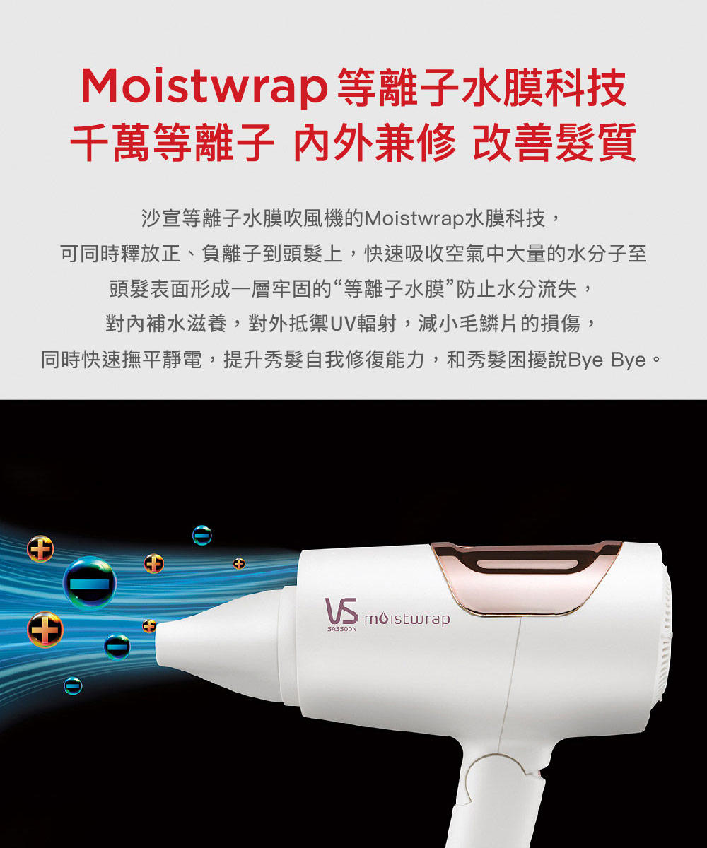 ◆Moistwrap等離子水膜科技,同時釋放正、負離子,快速將大量水分子帶到頭髮表面,牢牢鎖住水分。