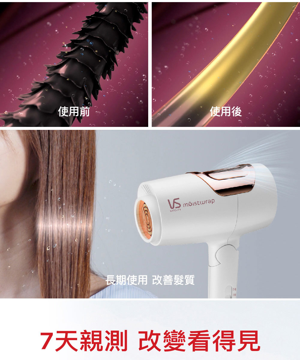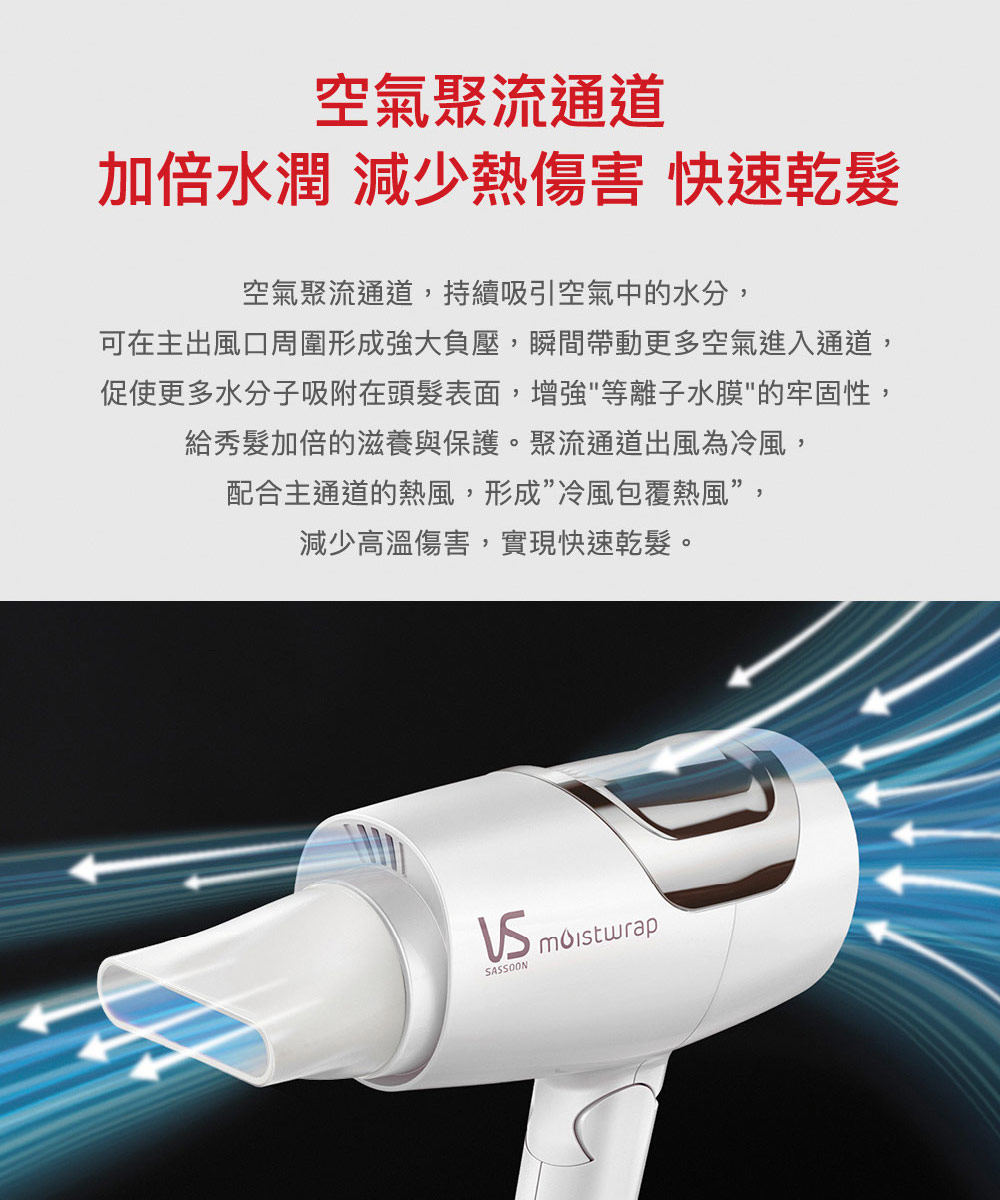 ◆獨特空氣聚流通道,促使水分子吸附於髮絲上,加倍水潤,增強等離子水膜的牢固性。