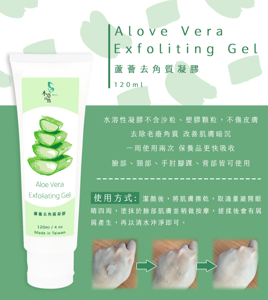 本草自然蘆薈去角質凝膠,溫和去除老廢角質,改善肌膚暗沉,增加保養品吸收力。凝膠無顆粒感,水溶性不含沙粒、塑膠顆粒,不傷皮膚。適用於臉部、頸部、手肘腳踝、背部,一周使用兩次,讓您的肌膚更加光滑細緻。