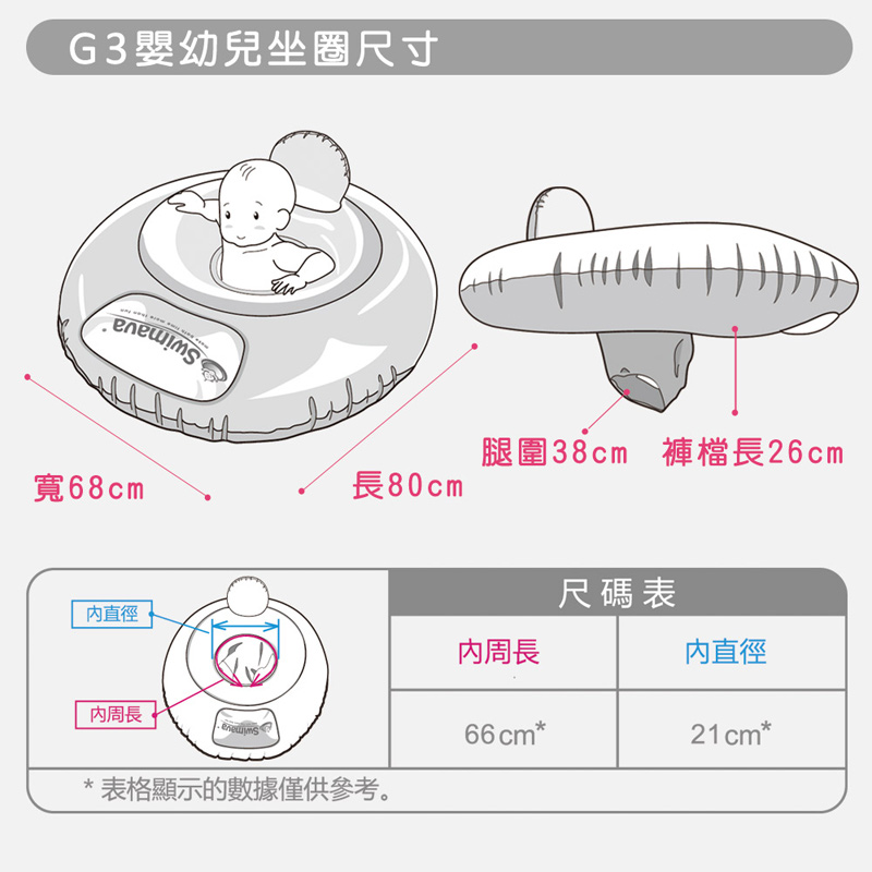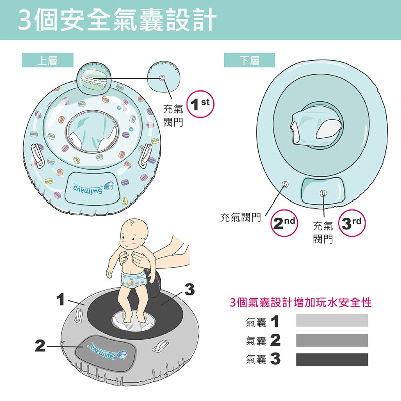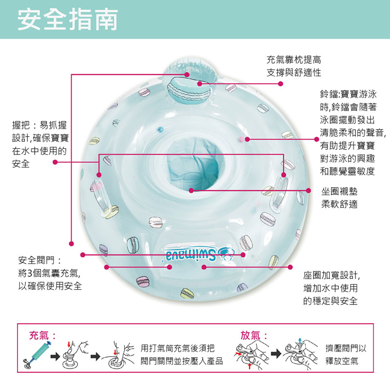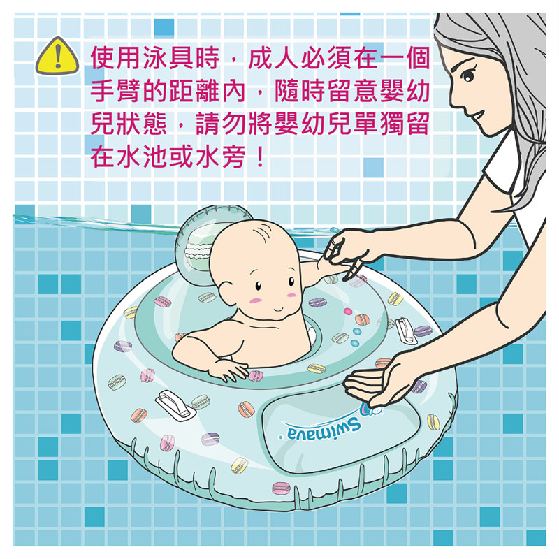 - 請留意使用任何一款泳圈,當寶寶拍水時須隨時留意寶寶重心,避免翻覆