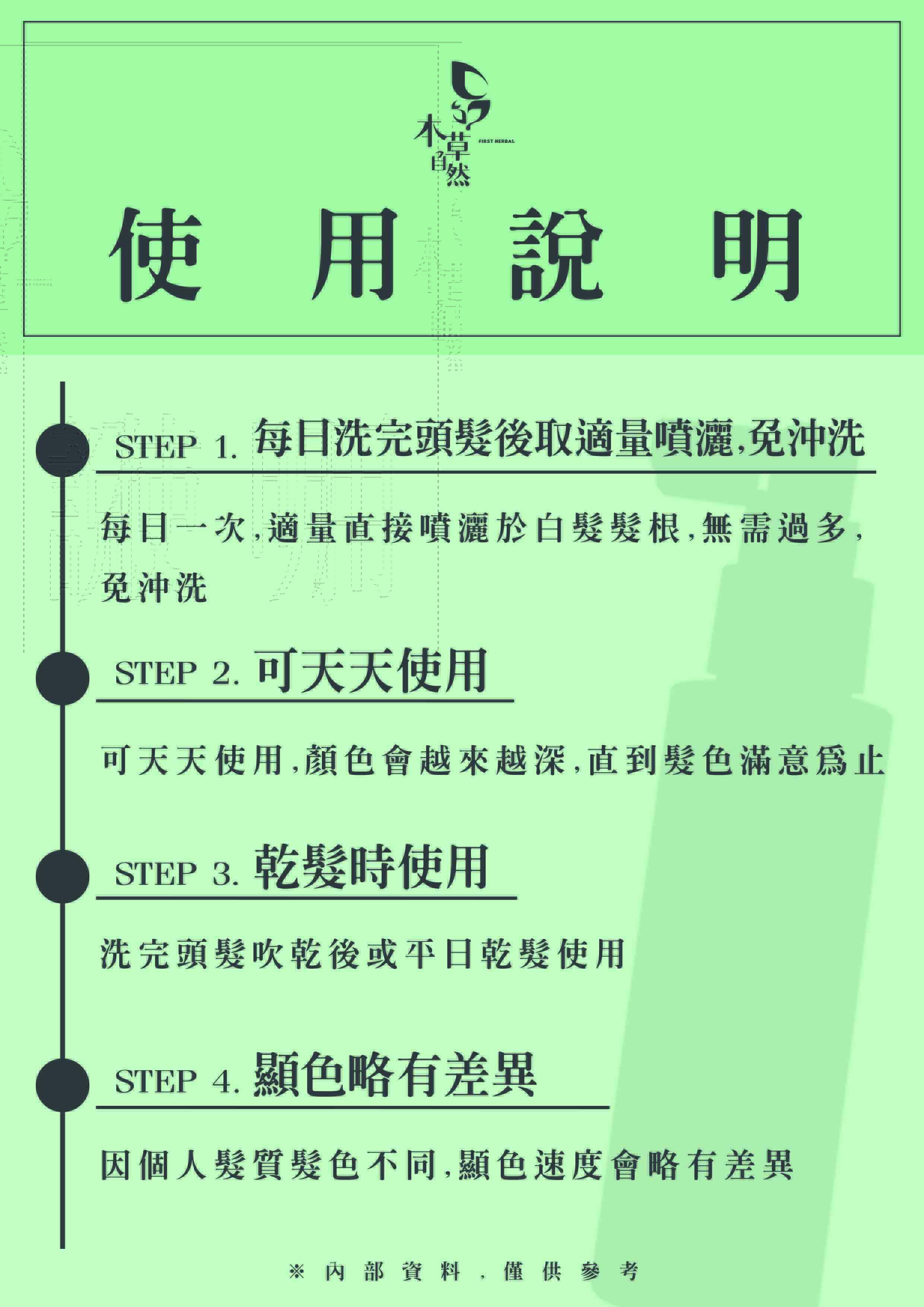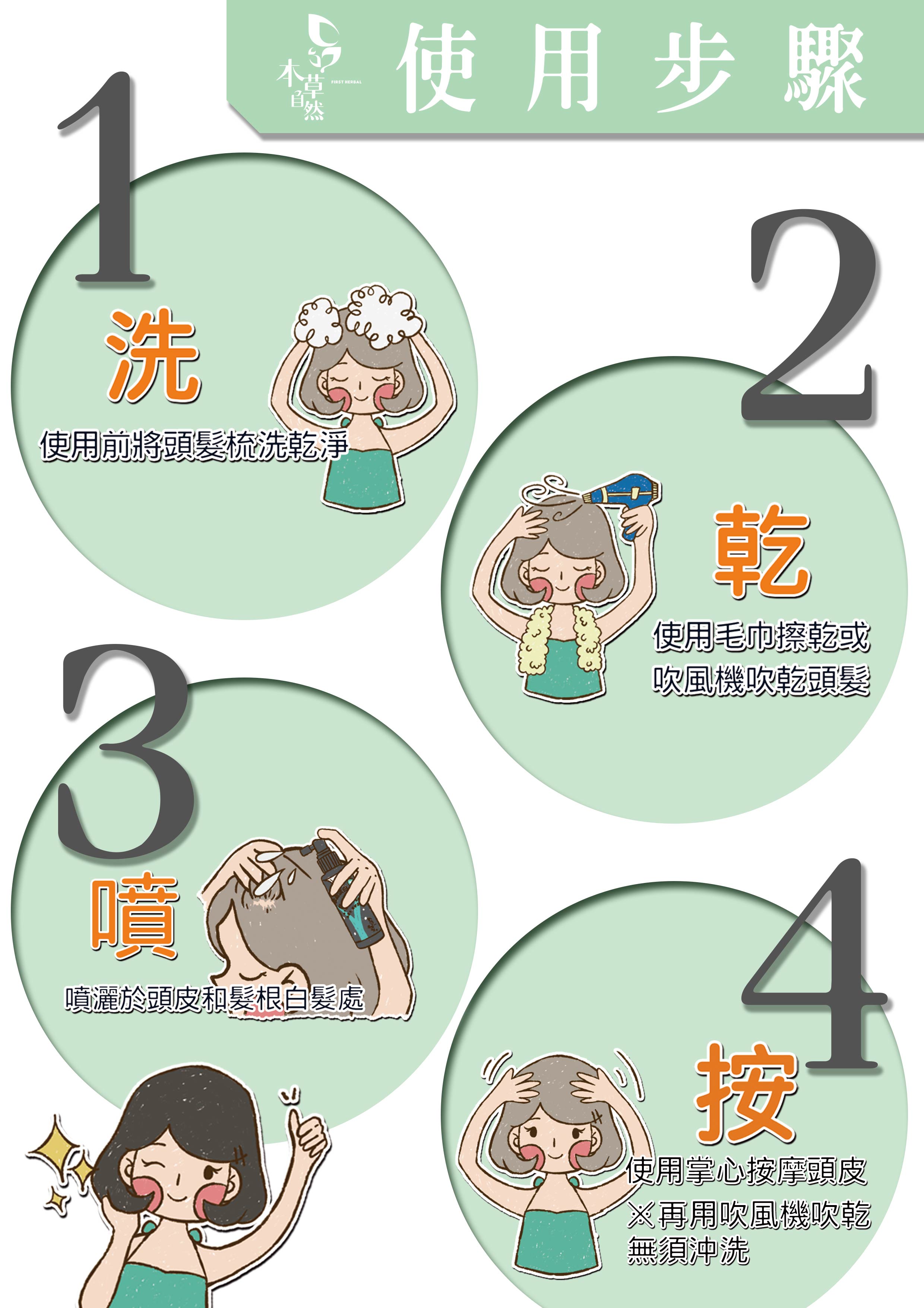 使用方法:每日一次,適量噴灑於白髮髮根至完全吸收。可天天使用,使用後顏色會越來越深。