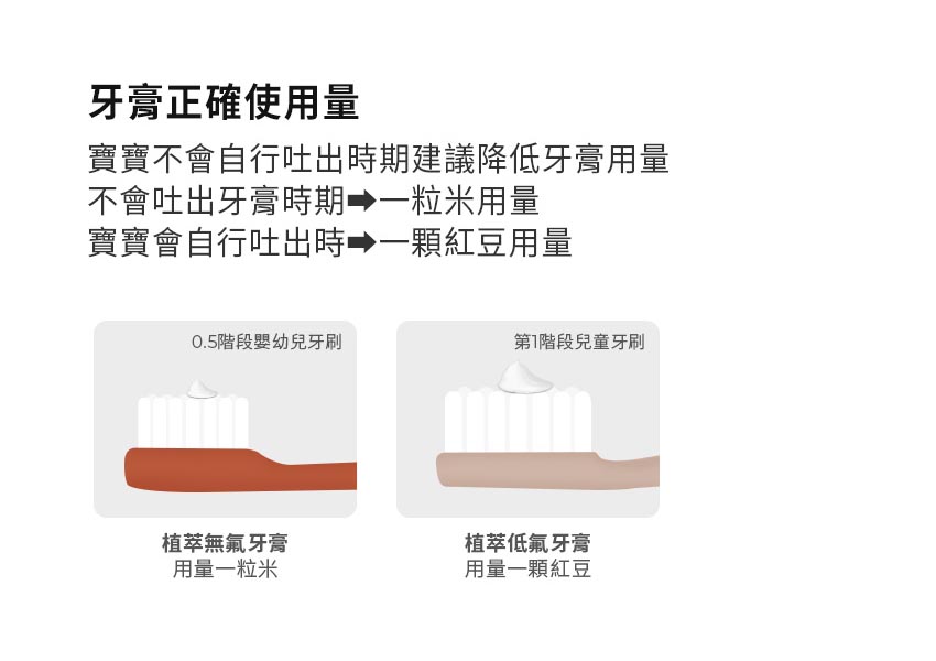 - 不會吐出牙膏時期➡一粒米用量(植萃無氟牙膏)