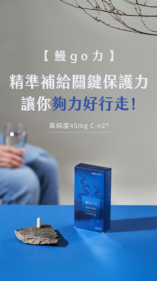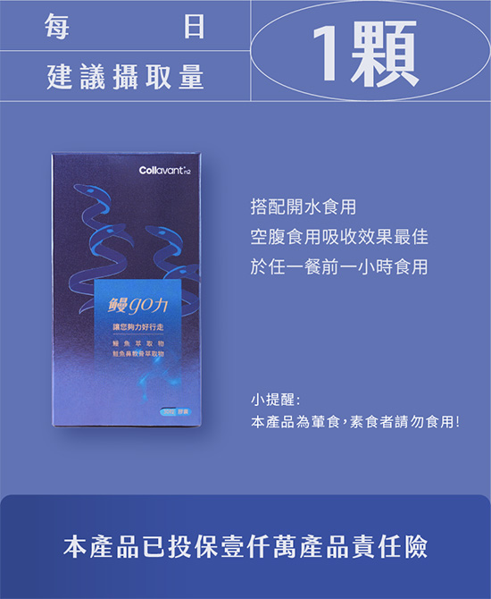 - 獨家鰻魚精萃,鞏固耐力、持久力,讓您如同鰻魚一樣靈活咕溜。歐洲專利Collavant®n2,每錠添加最高等級45mg,有效緩和,提升靈活舒適度。日本專利鮭魚鼻軟骨萃取物(含蛋白聚醣),給足支撐與穩定,喚醒沉睡已久行動力。「鞏固」與「緩和」雙效並行,讓您的每一步更加穩健!