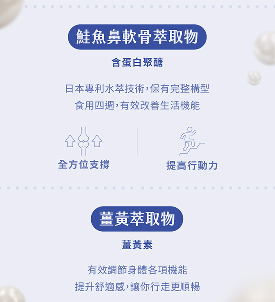 - 鮭魚鼻軟骨萃取物給足支撐與穩定,添加最高等級45mg。