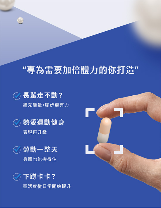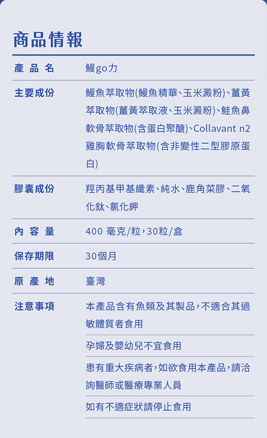 - 加乘配方,不只效果加倍,更是全方位提升,鰻go力,讓你夠力好行走。