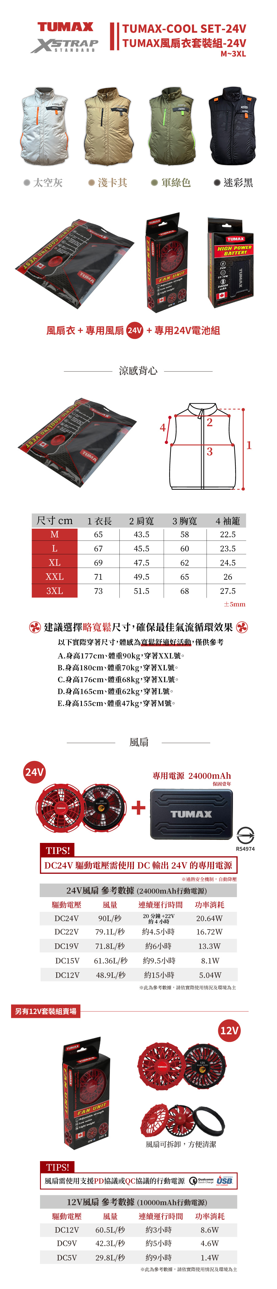 TUMAX 風扇衣套裝組 24V 專用電池組 四種顏色(淺卡其、太空灰、軍綠、迷彩黑) 四種尺寸(M~3XL)◉70D047