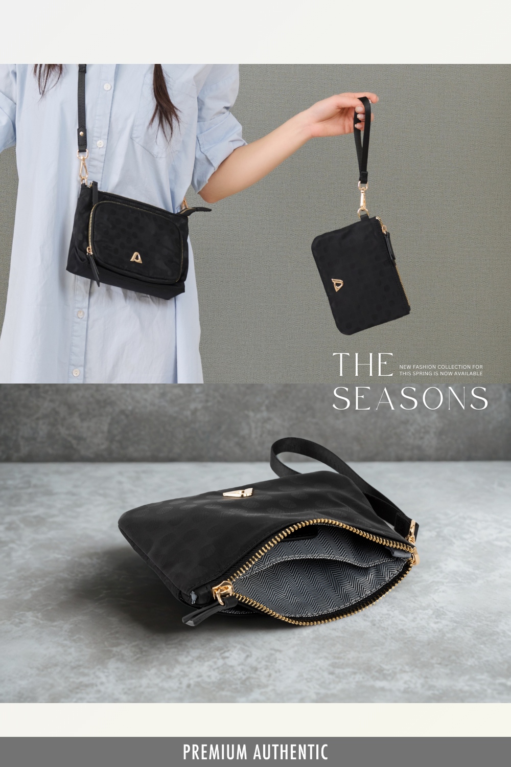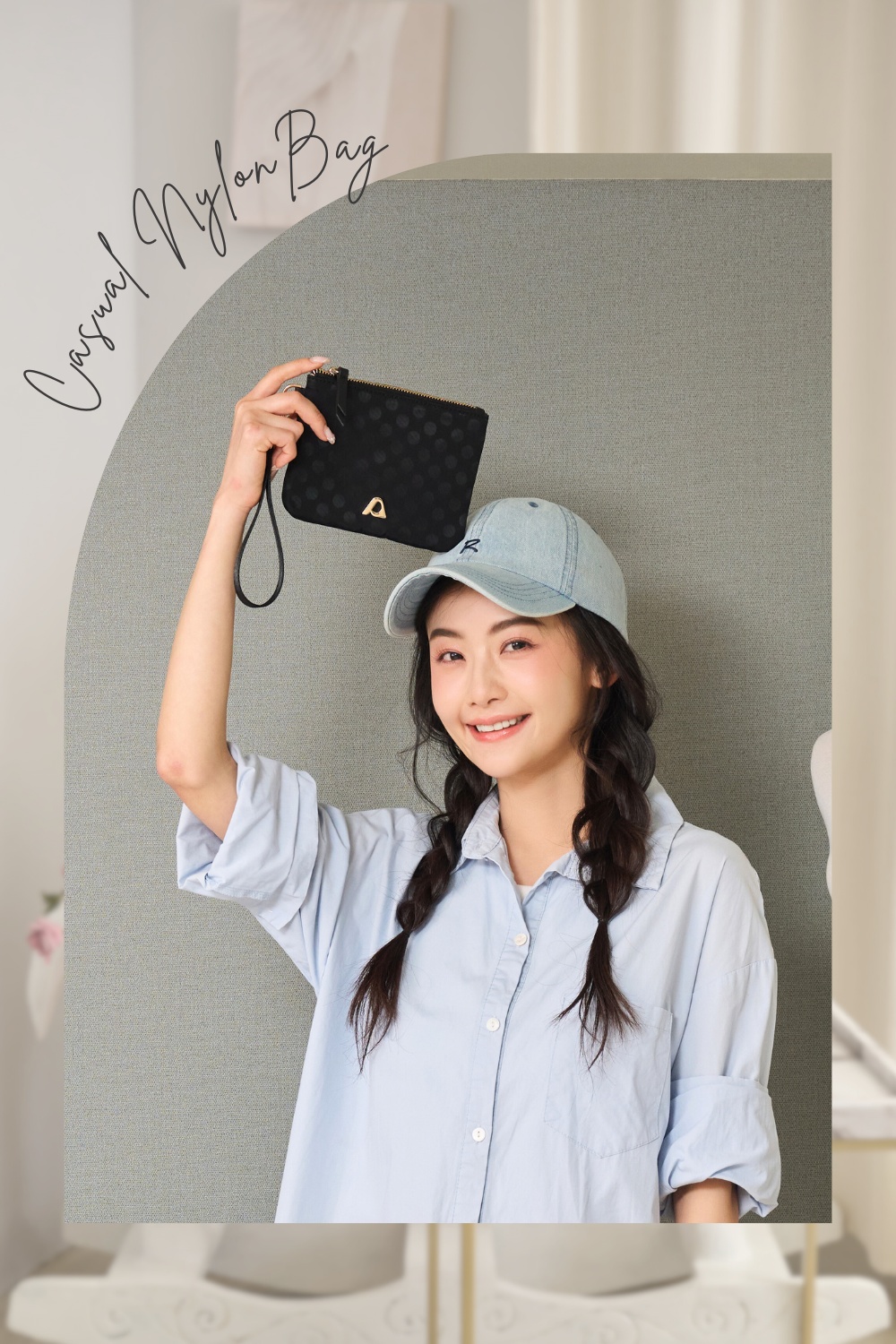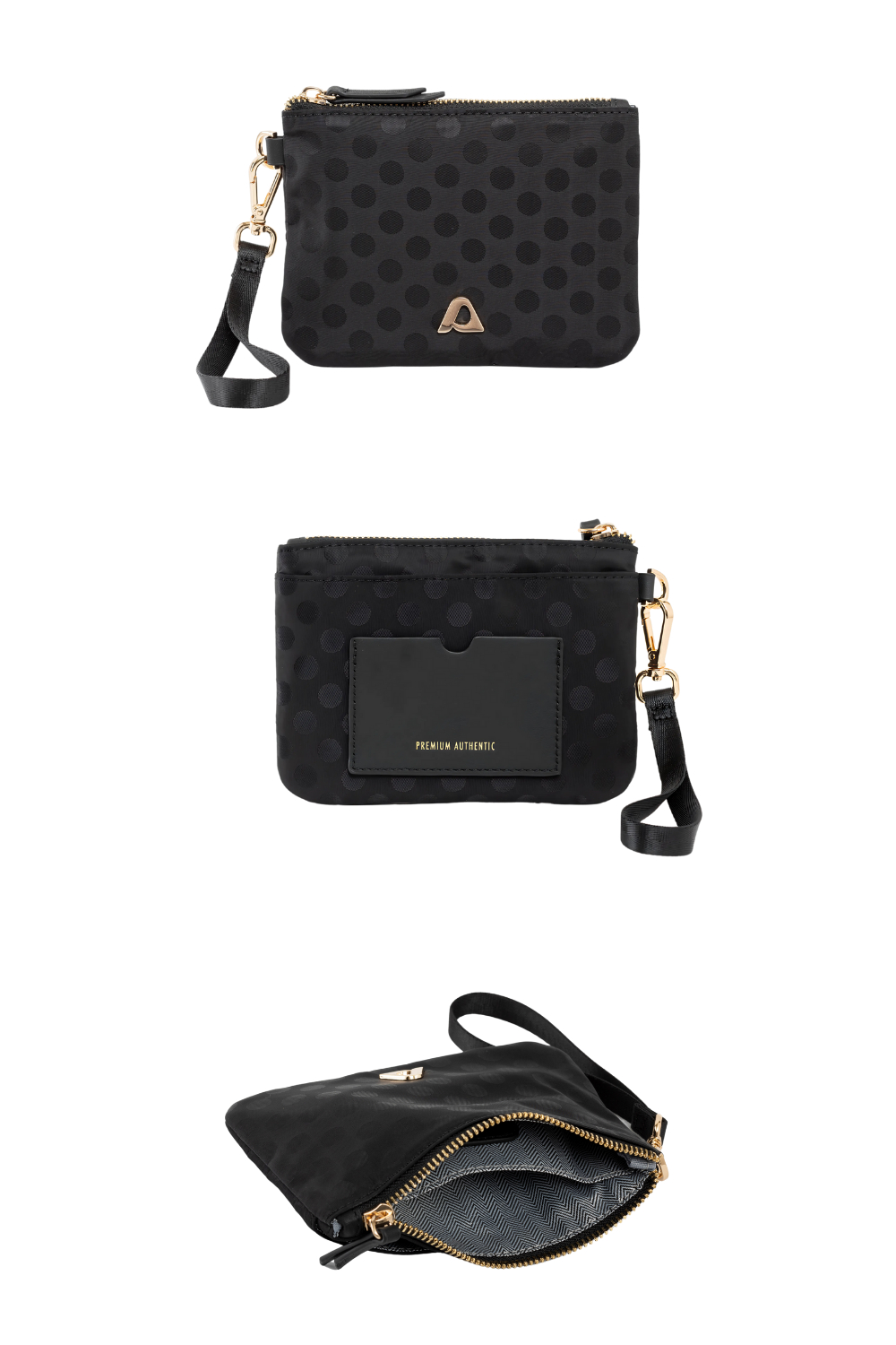 - PA.金色圓舞曲手拿輕巧包雖為尼龍搭配部分真皮材質,採用簡約圓點設計,包包附贈掛繩 可讓您輕鬆攜帶或掛在其他包包內,無論是作為包包內的精緻配件,還是外掛使用,都能展現獨特的個性。