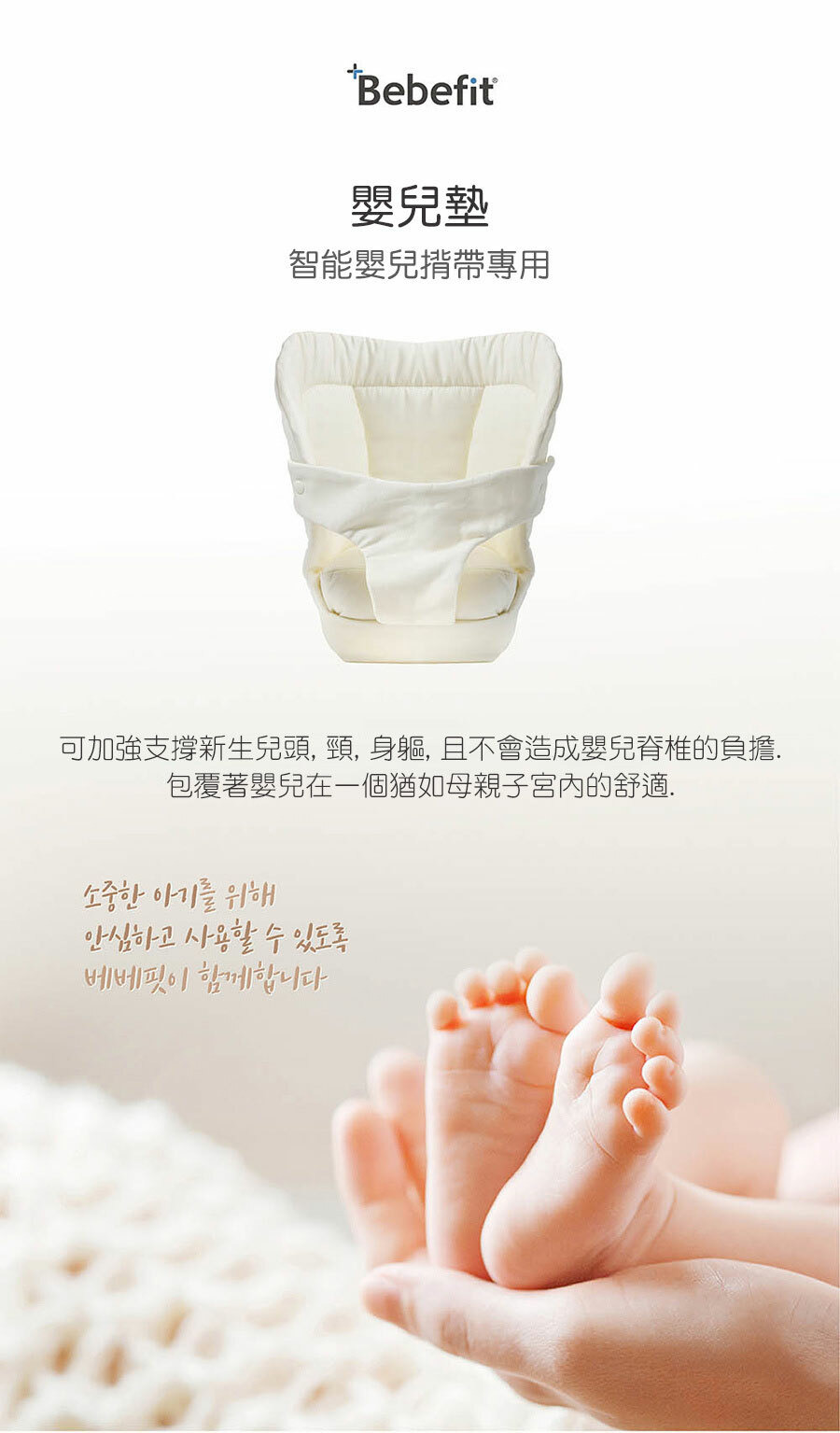 智能嬰兒揹帶專用嬰兒墊,加強支撐新生兒頭、頸、身軀,人體工學設計讓寶寶在揹帶內很安穩