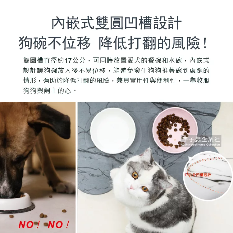 - 內嵌式雙圓凹槽設計,狗碗不位移,降低打翻的風險!
