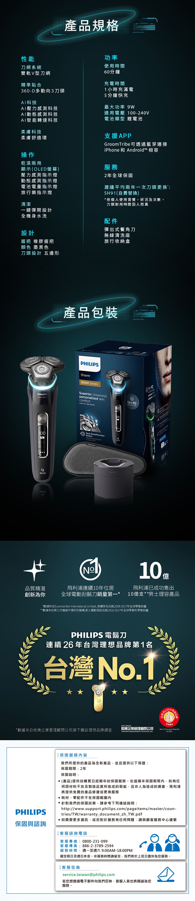 PHILIPS 飛利浦 Shaver series 9000乾濕兩用電鬍刀