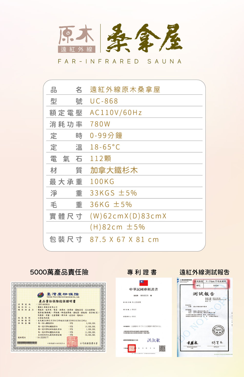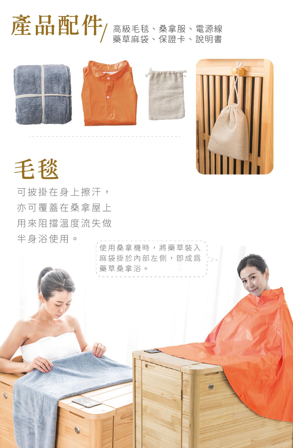 - 附贈:高級毛毯、桑拿服、藥草麻袋、說明書、保證卡