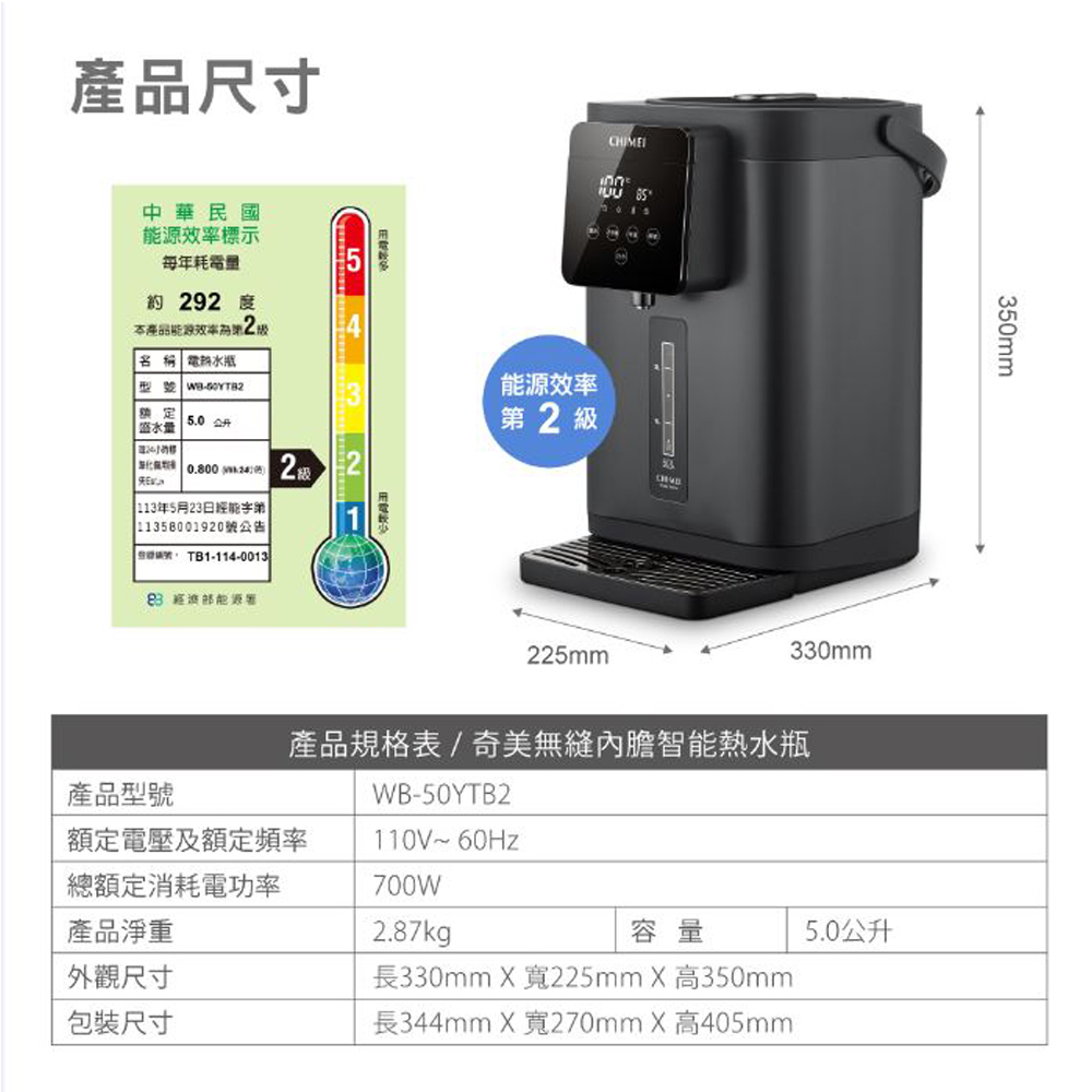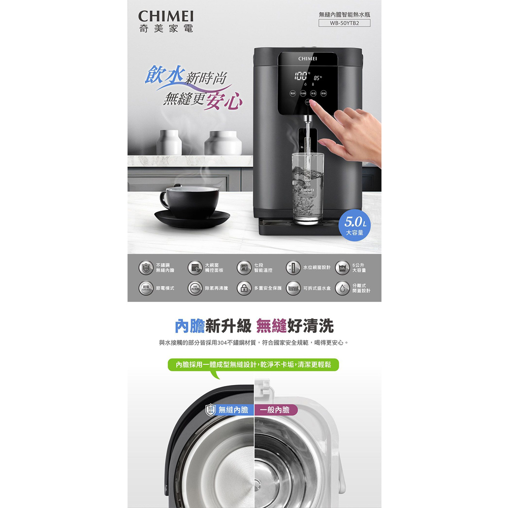 CHIMEI 奇美 5L大視窗無縫內膽熱水瓶 WB-50YTB2◉80B034