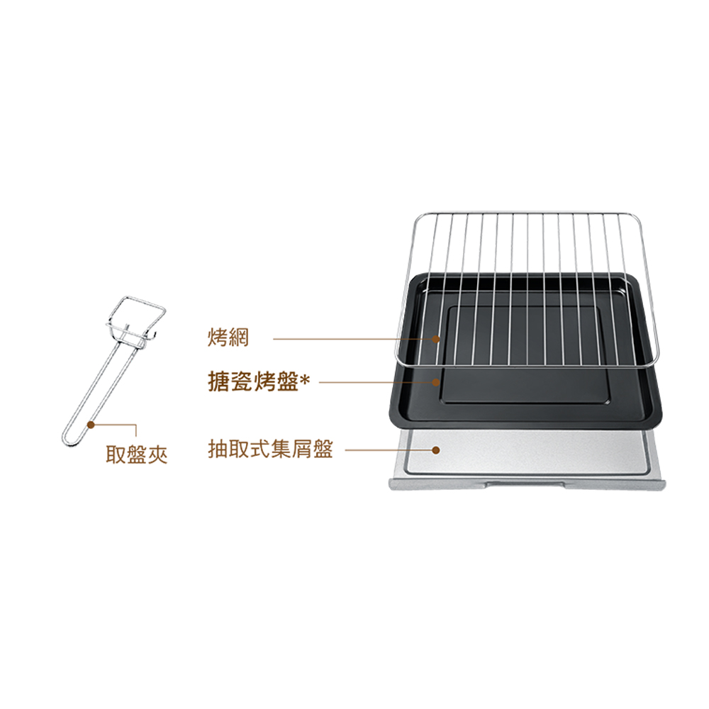 配件組:抽取式烤網、搪瓷烤盤、集屑盤與取盤夾