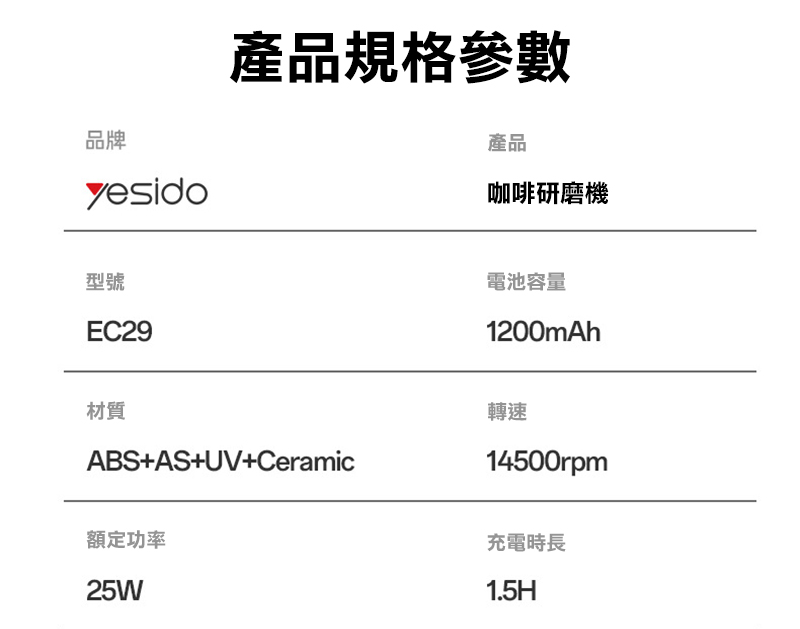 - 內容物:yesido EC29 電動咖啡研磨機*1、充電線*1、毛刷*1、內托海綿*2