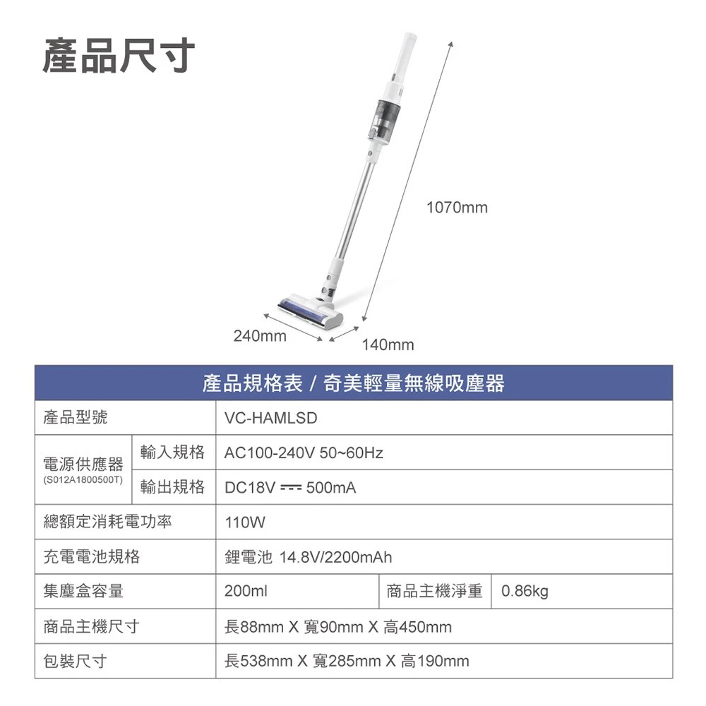 CHIMEI 奇美 超強吸力輕量無線吸塵器 VC-HAMLSD◉80B034