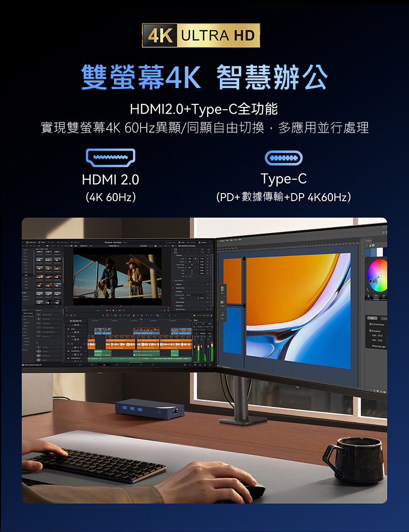 .輸出:HDMI 2.0(4K 60Hz) + 全功能 Type-C(4K 60Hz)