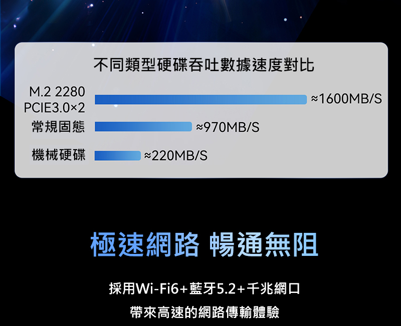 .網路:無線 WIFI 6(2.4G/5G) + 藍牙5.2+ RJ45 1000M