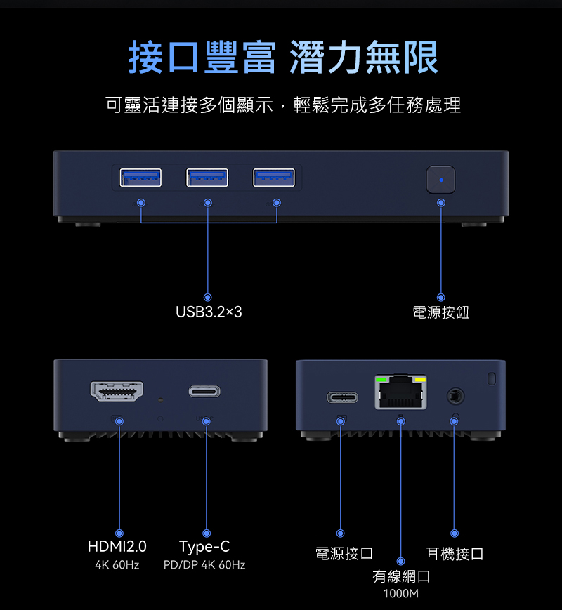 .連接埠:USB 3.2*3、HDMI 2.0*1、RJ45(1000M)*1、Type-C*2、Audio Jack(3.5mm)*1