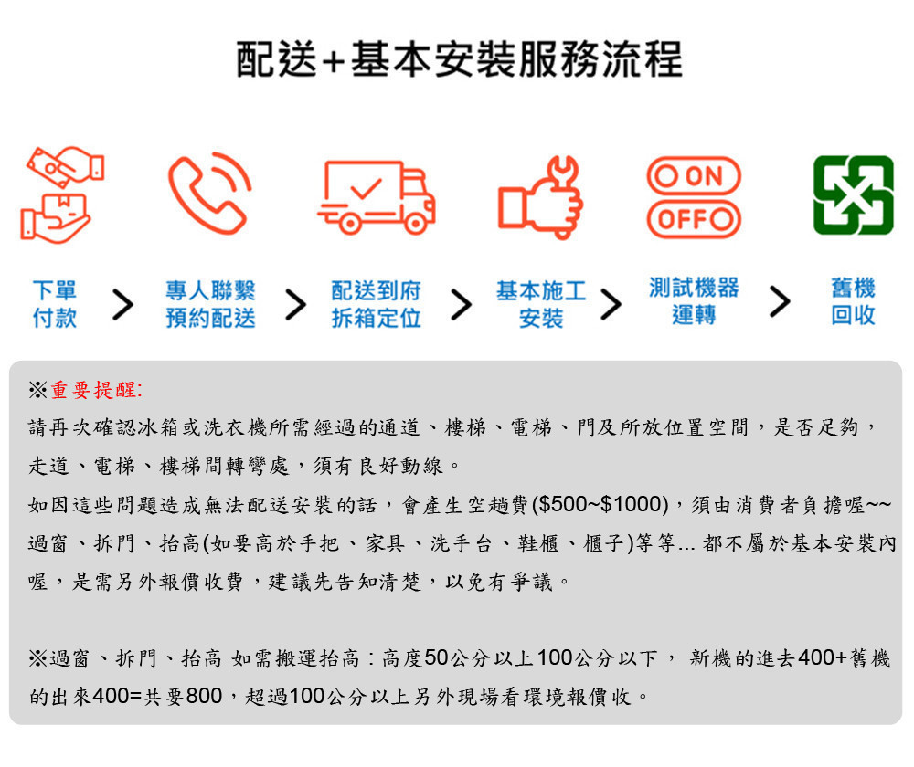 ■ 若要配送安裝請先告知地區、樓層、有無舊機回收(雙北以外地區、偏遠地區、樓層無電梯需另加價)