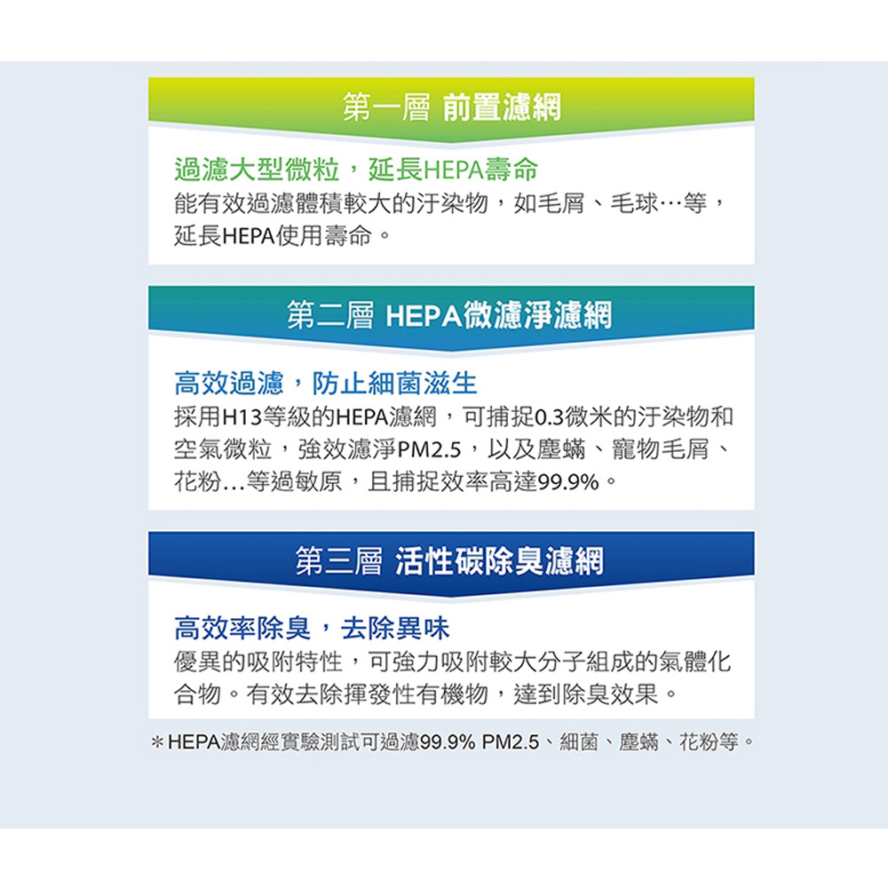 適用濾網:前置濾網+H13 HEPA微濾淨濾網 + 活性碳濾網