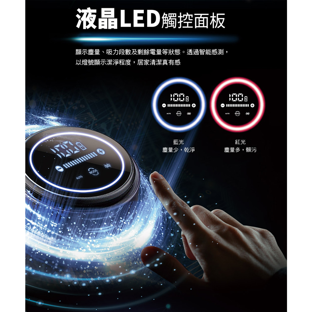 - LED觸控面板,可顯示塵量電量