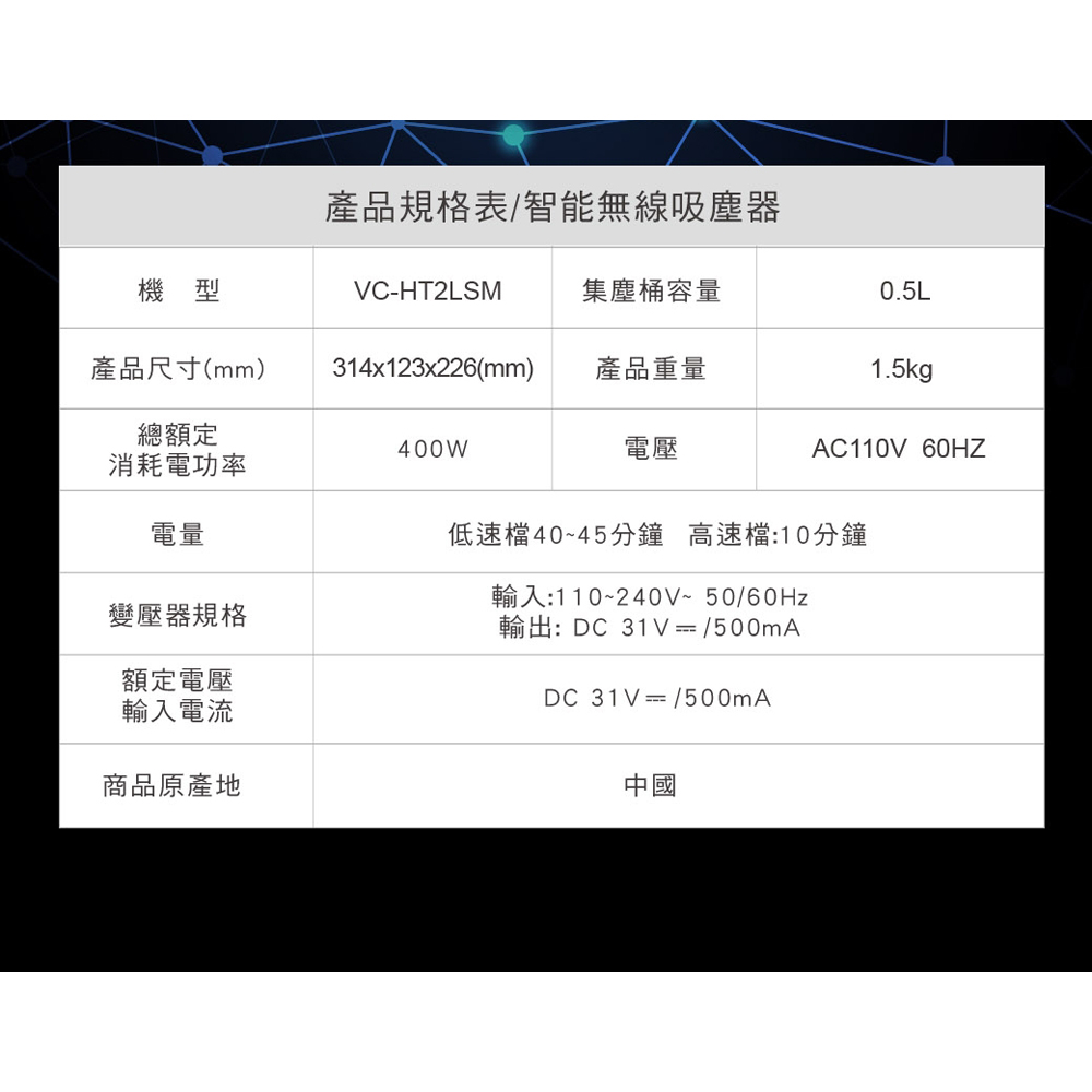 配件:HEPA濾網, 二合一毛刷, 狹縫吸頭, 伸縮鋼管, 毛刷吸頭