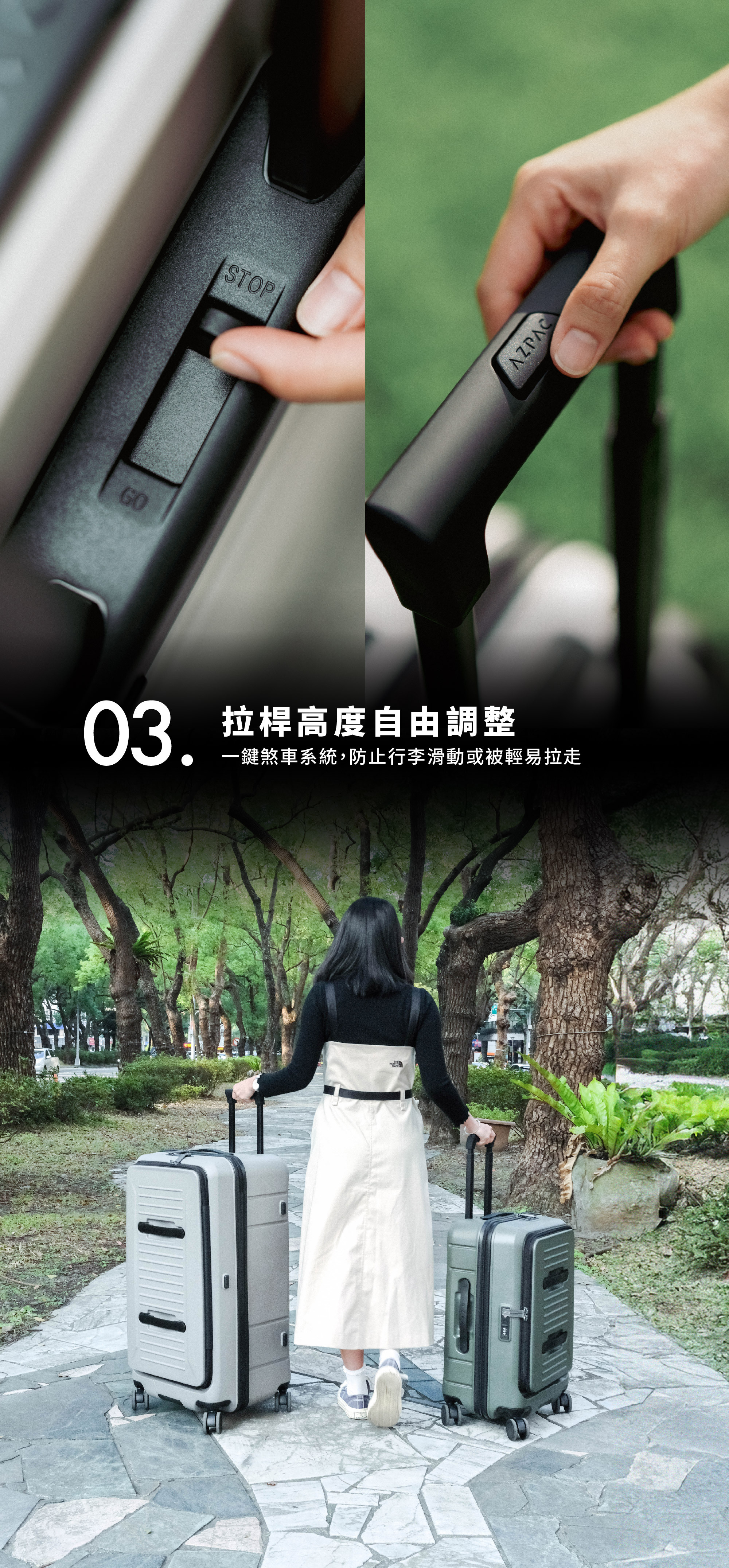 安全守護: 全箱採用 YKK 防穿刺雙層拉鍊,搭配一鍵煞車系統,在人潮擁擠的月台,也能防止行李滑動或被輕易拉走。