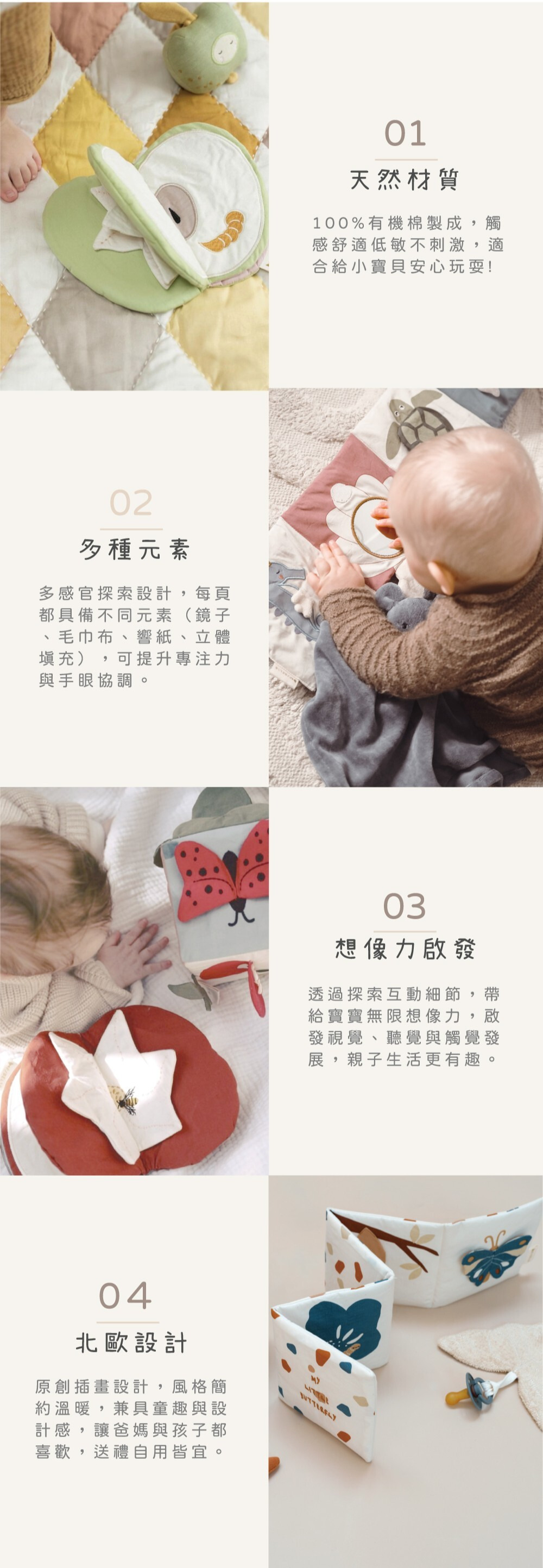 親子互動就靠這一本! 100%有機棉製成,色彩柔和、觸感舒適,逗趣的圖案搭配嚮紙,每次翻頁都吸引寶寶的注意力,促進寶貝感官發展,淺顯易懂的可愛小故事,讓寶貝在樂趣中學習的更開心,一起享受美好的親子時光!